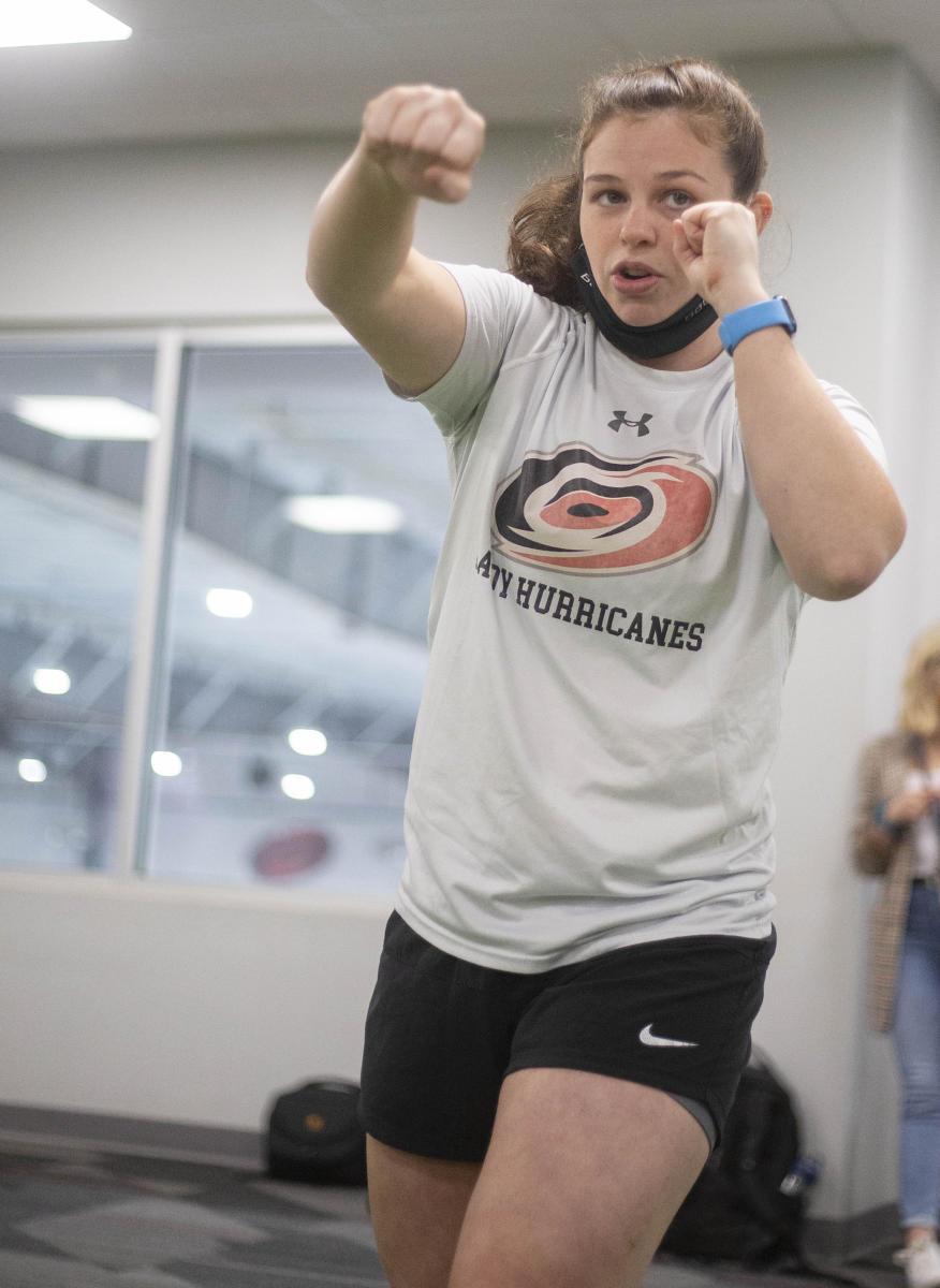 Colleen Murphy teaches the Jr. Canes some kick boxing moves at the end of the Canes Girls Hockey off-ice training with members of the Lady Hurricanes team during a camp hosted at Wake Competition Center on Saturday, April 10, 2021.